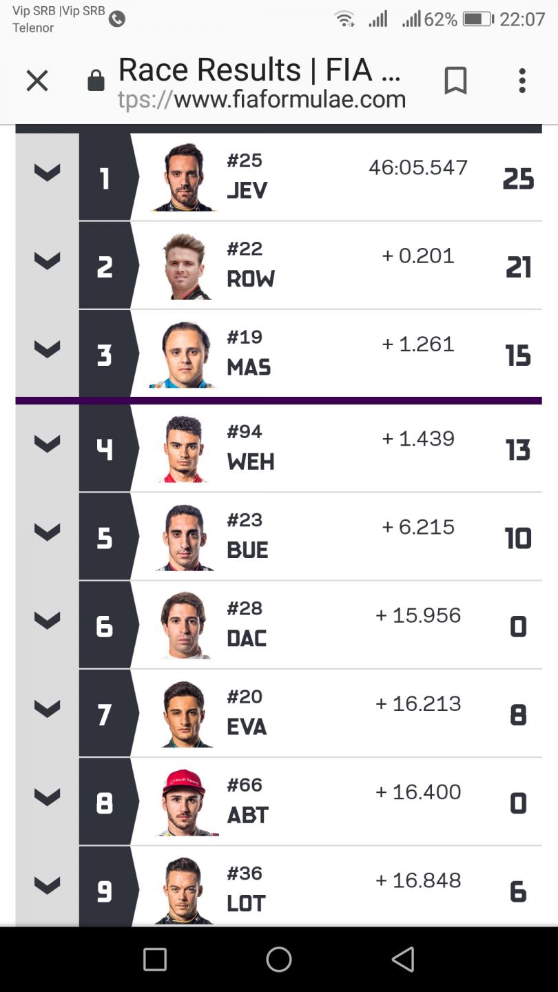 silenci 2804 Posted March 10, 2019 (edited) odlicna trka,Loterer skoro vodio citav trku,al krug pre kraja imao defekt,pukla guma,zahvaljujuci Birdu,koji ga je gurao i tamo mu ostetio gumu https://www.fiaformulae.com/en/results/race-results al Bird kaznjen pa je tamo Edoardo Mortara pobednik trke Edited March 10, 2019 by silenci 1 dach@ reacted to this Quote Share this post Link to post Share on other sites